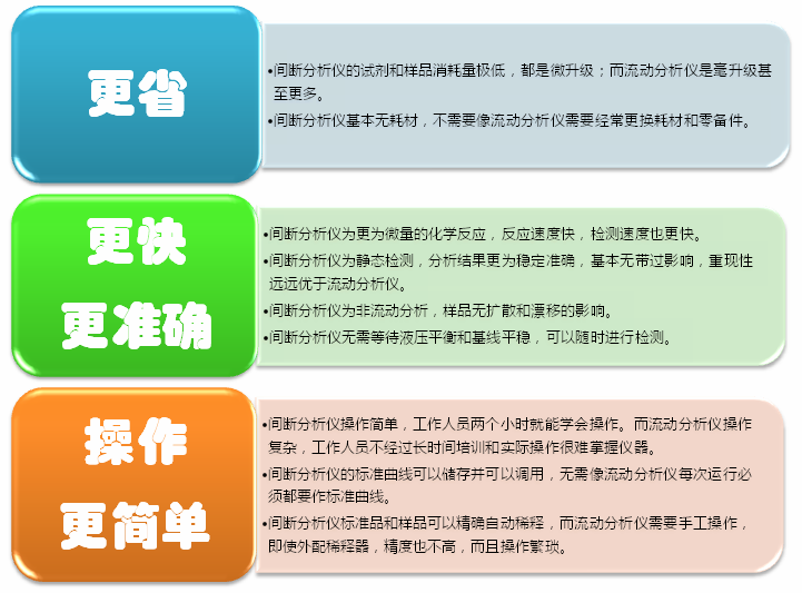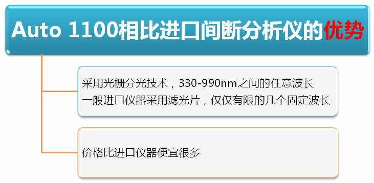 間斷分析儀采用經典比色原理,但突破了流動注射和片斷流分析儀液體連續流動的模式,使用機械手臂把試劑和樣品精確地加入反應管,混和、加熱、反應顯色后的樣品在靜止狀態測量。整個檢測過程完全實現自動化。