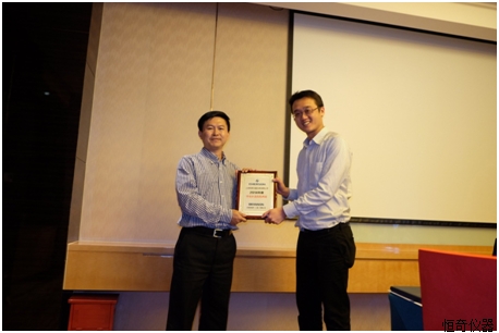 美國必能信(BRANSON)亞洲區(qū)產(chǎn)品總監(jiān)David Lee為左總頒發(fā)“2014年度杰出代理商獎”