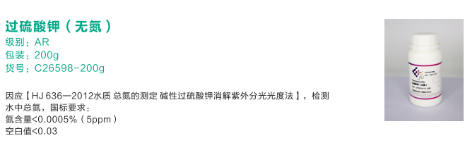 過硫酸鉀(無氮)C26598-200g應用國標簡介總氮是指水體中有機氮和無機氮含量的總和,總氮是控制水質的一項重要指標。因應【HJ636—2012水質總氮的測定堿性過硫酸鉀消解紫外分光光度法】,檢測水中總氮,國標要求:氮…