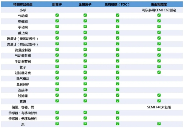 根據(jù)標(biāo)準(zhǔn)SEMI F57:用于超純水和液態(tài)化學(xué)品輸送系統(tǒng)的聚合物材料及組件的規(guī)范文件要求,評(píng)價(jià)半導(dǎo)體輸送管道的性能,鑒于浸泡液的成分多樣性,需要儀器具有極強(qiáng)的抗干擾能力,同時(shí)對(duì)于潔凈與污染的評(píng)估需求,需要儀器既具有高靈敏度,又具有寬范圍的能力。