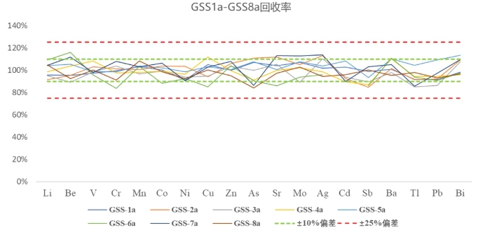 使用PlasmaQuant MS進行分析,由以上結(jié)果可知,19種元素回收率大大優(yōu)于標準要求,并且GSS1a,GSS2a19種元素回收率均滿足標準樣品證書不確定度范圍的要求。