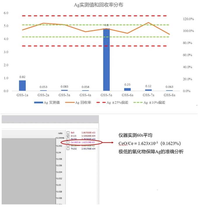 除去準確度要求外,另一個難點是質(zhì)譜干擾,HJ 1315-2023測定的19種元素中受氧化物影響最大的元素是Ag,受ZrO影響,且Zr在土壤中的含量較高(一般為150-250 mg/kg左右),而Ag的含量僅為0.05-1.00 mg/kg,所以Ag受ZrO的影響較大,PlasmaQuant MS首創(chuàng)地采用了第二代前置式碰撞反應池iCRC系統(tǒng),可以輕松的將氧化物干擾壓制到0.2%以下,使Ag的測試更為準確。