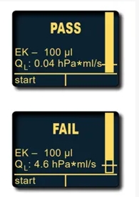 PLT會依據國際標準ISO 8655-2對檢測情況進行判定,在屏幕中顯示結果,右側的條形圖表示QL的臨界值與泄露情況。